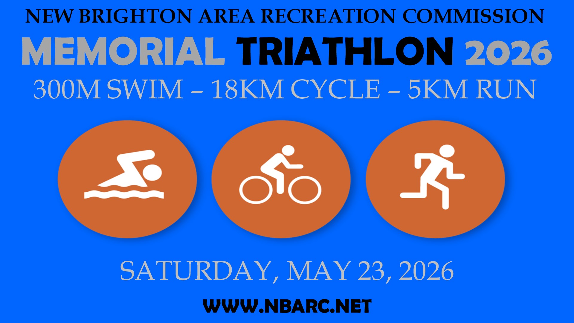 Sponsored by the New Brighton Area Recreation Commission, the annual triathlon returns in 2026 on Saturday, May 23. The event begins at the New Brighton High School at 8:00 AM and includes a 300M swim at the Sunrise Pool, an 18KM cycle through Pulaski Township and Daugherty Township, and a 5KM run through New Brighton Borough. Visit www.nbarc.net to register online or to get more information. Electronic copies of the run and bike course maps are also available online.
