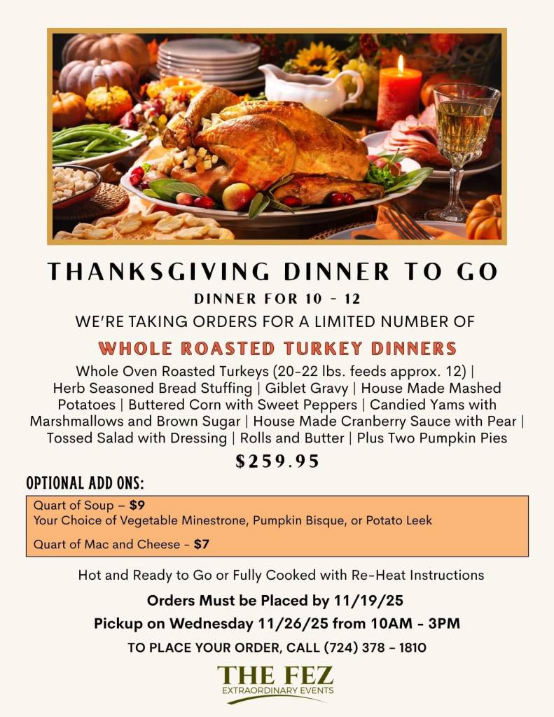 Download Official Event FlyerLet us handle the cooking this Thanksgiving! Preorder a whole roasted turkey dinner (feeds 10–12) for pickup on Wednesday, November 26th between 10 AM–3 PM.