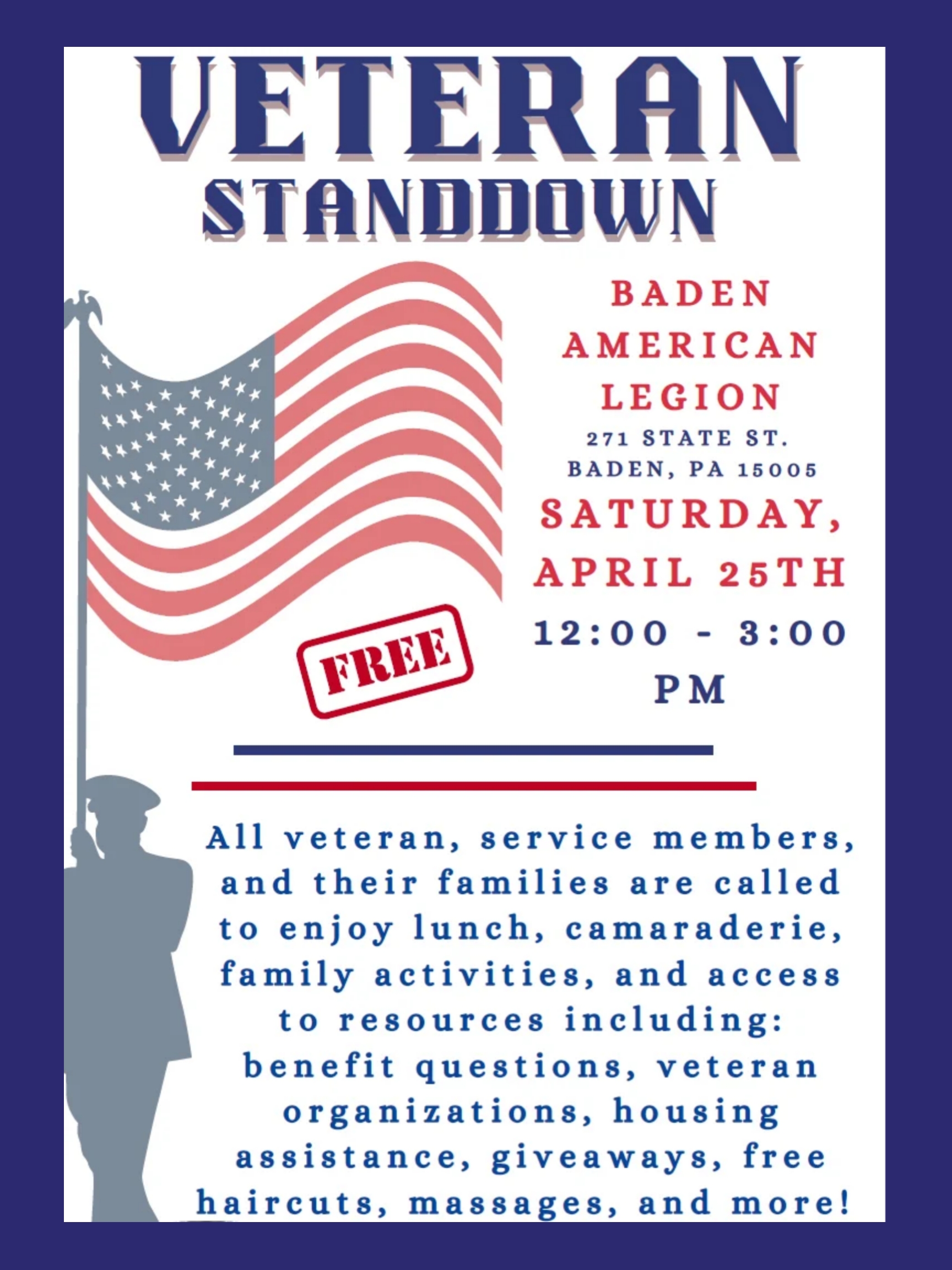 Download Official Event FlyerThis is an event being held at the Baden American Legion Post 641, featuring vendors from various groups and organization focused on helping veterans and families with information and resources available to them. It's all free of charge, including a hot meal.